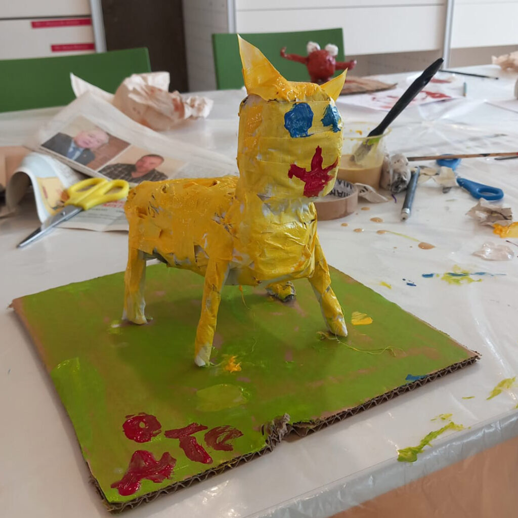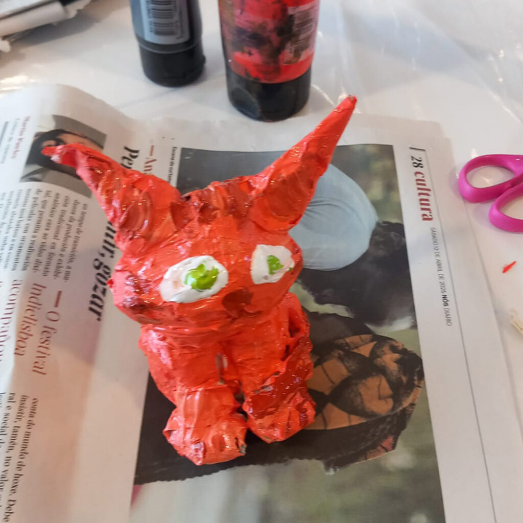 A actividade comezou cun exercicio de debuxo, no que cada participante elaborou un boceto do animal que quería crear. A partir desa idea inicial, Electra guiou o proceso para transformar eses debuxos en figuras tridimensionais, empregando papel de xornais e cinta.
